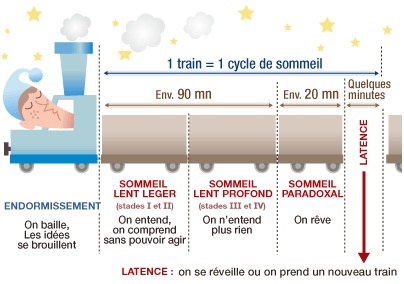 On sait que nous avons des cycles de sommeil qui dure entre lh30 et 2h00 avec le passage d’une phase d’endormissement à une phase de sommeil léger, profond puis paradoxal (rêves). Pour expliquer ce phénomène, on peut prendre la métaphore d’un train. Ainsi, lorsque l’on sent les premiers signes d’endormissement (bâillements, picotements dans les yeux…), il faut prendre le train du sommeil, car après c’est plus difficile de s’endormir. On devra parfois attendre que le prochain train ne passe.